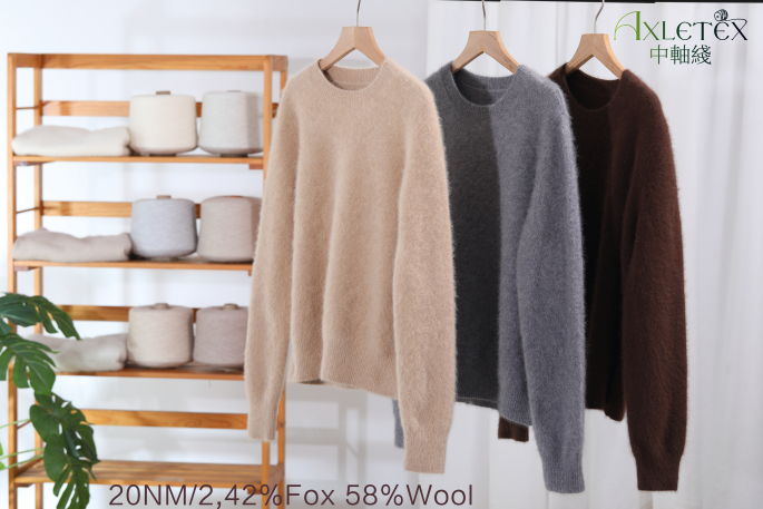 AXLETEXは、タヌキとギツネのベールを中心に、秋冬セーター独特のふんわりとした肌触りと保温効果を生み出している。