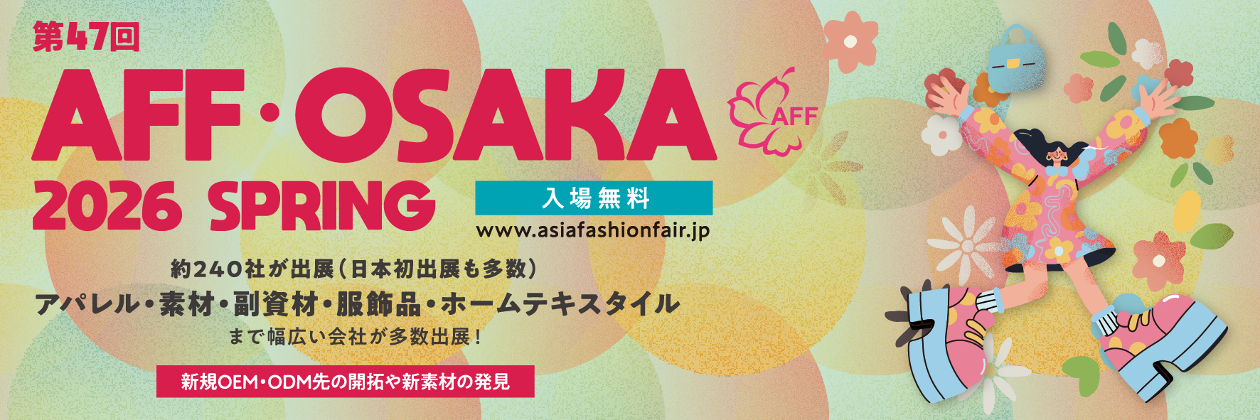 第47回AFF・大阪2026春展では、中国をはじめ東南アジア各国より、アパレル、素材、服飾品、ホームファッションなど多彩な企業が出展予定です。開催規模は